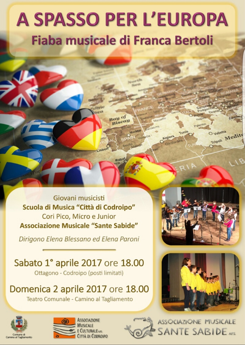 Sabato 1° aprile in Ottagono a Codroipo e domenica 2 aprile 2017 nel teatro di Camino al Tagliamento giovanissimi strumentisti della Scuola di Musica “Città di Codroipo”, in collaborazione con i Cori Pico, Micro e Junior dell’Associazione “Sante Sabide” di Goricizza rappresenteranno una fiaba musicale scritta da Franca Bertoli, “A spasso per l’Europa”. Un viaggio tra i vari stati europei, rappresentati attraverso le loro sonorità tradizionali.
