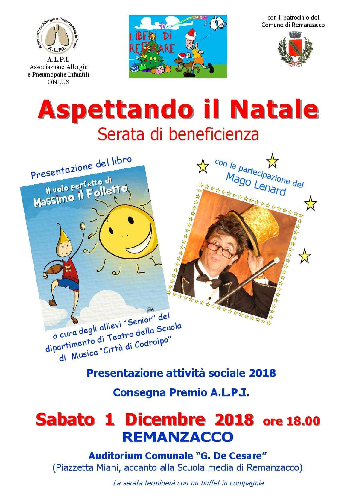 Sabato 1° dicembre all’auditorium di Remanzacco alle ore 18, “Aspettando il Natale”, serata di beneficenza, con la speciale partecipazione del gruppo Senior del dipartimento di Teatro della Scuola di Musica “Città di Codroipo”.