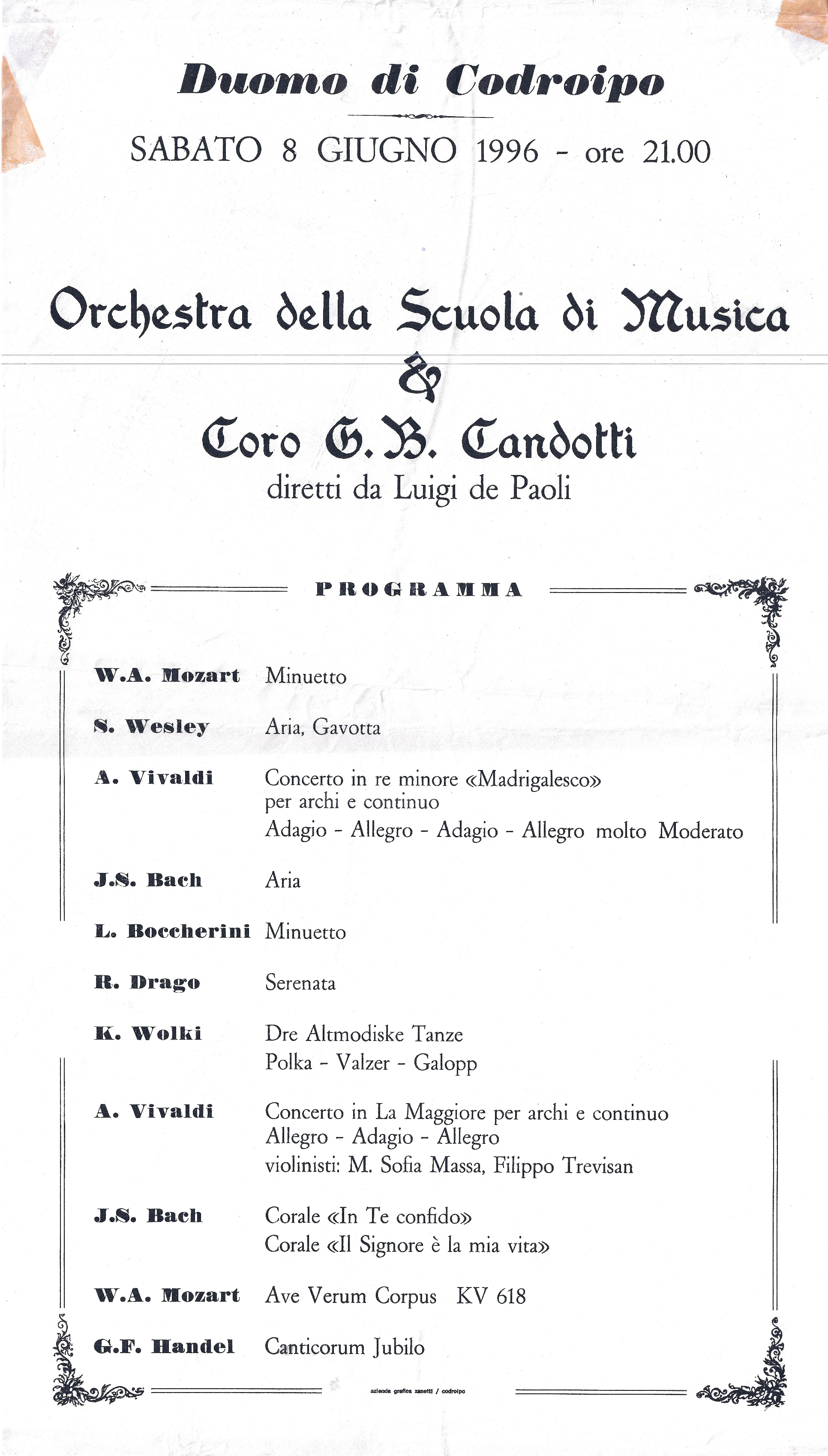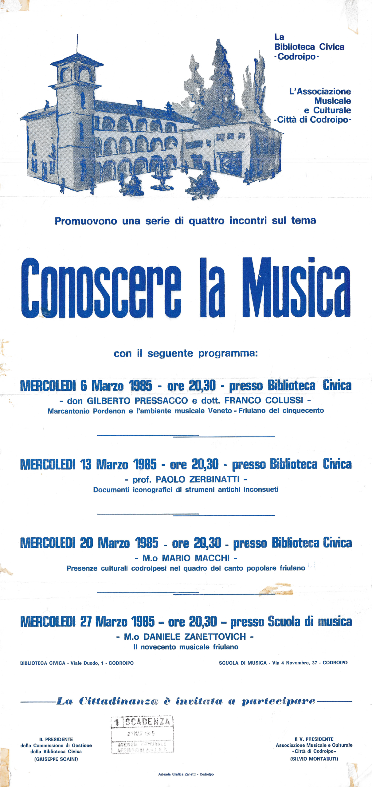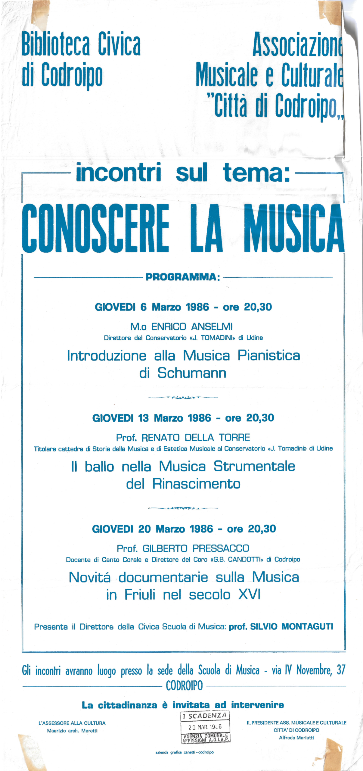 L’Associazione che si occupa da oltre venticinque anni di formazione musicale e organizzazione di concerti, gestisce la Scuola di Musica “Città di Codroipo”. La Scuola è strutturata secondo due percorsi di studi: libero (secondo le esigenze dell’allievo amatoriale) e ministeriale (secondo i programmi di studio conservatoriali e/o professionali) in linea con la nuova riforma dei programmi in corso. Vengono organizzati corsi di formazione musicale, dalla base (a partire dai 6 mesi d’età con il metodo Gordon e dai 3 anni di età con il metodo Willems) fino a raggiungere l’alta formazione e la preparazione degli allievi al confronto con gli istituti musicali superiori e l’università musicale. Nata come Scuola di musica classica, si caratterizza dal 2006 per i suoi quattro dipartimenti educazione musicale, classica, pop-rock e jazz estendendo il suo campo d’azione e interessando un numero crescente di persone. Vengono organizzati corsi strumentali individuali e corsi di gruppo a seconda della disciplina oltre che seminari con docenti di rilievo nazionale ed internazionale per le varie aree di competenza. La scuola è attualmente diretta dal M° Giorgio Cozzutti L’associazione è attualmente presieduta da Mario Pivetta E’ possibile contattare la Scuola, che si trova a Codroipo in via IV Novembre n°35, ai…