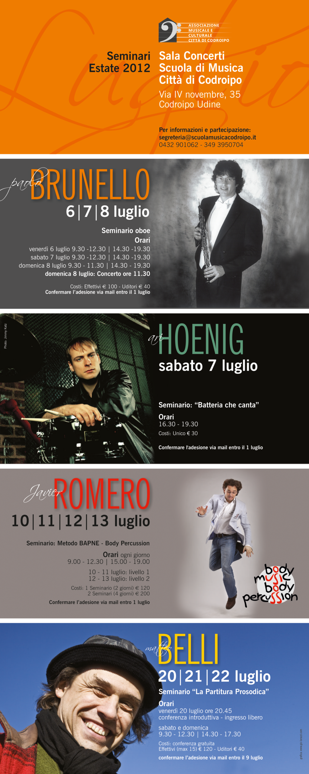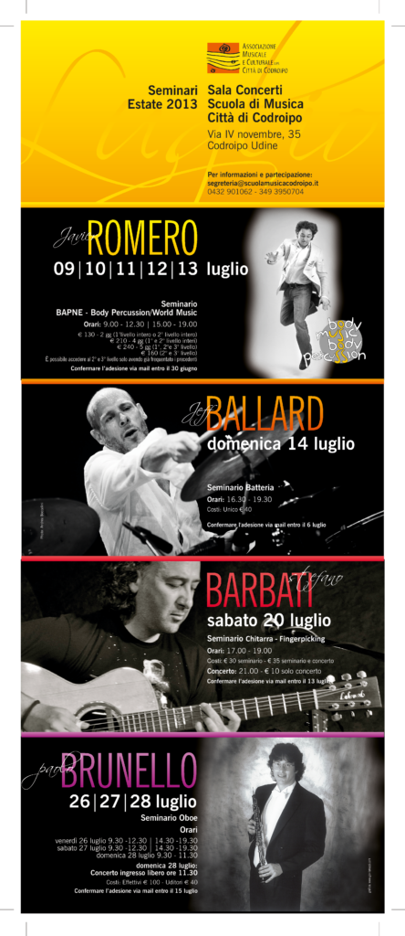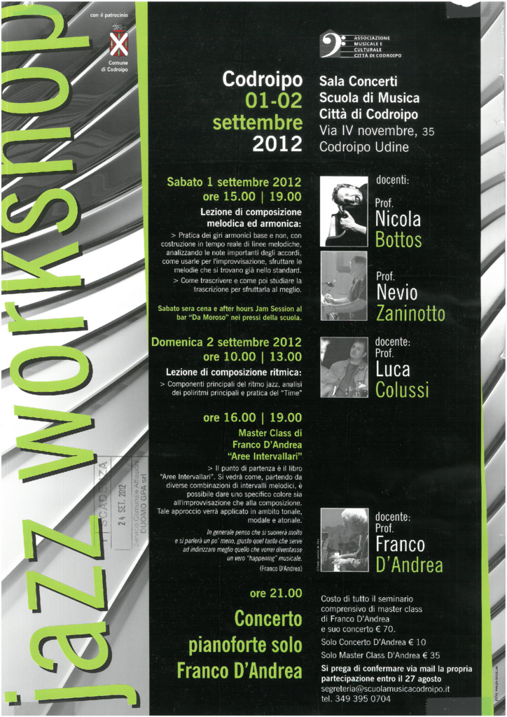 L’Associazione che si occupa da oltre venticinque anni di formazione musicale e organizzazione di concerti, gestisce la Scuola di Musica “Città di Codroipo”. La Scuola è strutturata secondo due percorsi di studi: libero (secondo le esigenze dell’allievo amatoriale) e ministeriale (secondo i programmi di studio conservatoriali e/o professionali) in linea con la nuova riforma dei programmi in corso. Vengono organizzati corsi di formazione musicale, dalla base (a partire dai 6 mesi d’età con il metodo Gordon e dai 3 anni di età con il metodo Willems) fino a raggiungere l’alta formazione e la preparazione degli allievi al confronto con gli istituti musicali superiori e l’università musicale. Nata come Scuola di musica classica, si caratterizza dal 2006 per i suoi quattro dipartimenti educazione musicale, classica, pop-rock e jazz estendendo il suo campo d’azione e interessando un numero crescente di persone. Vengono organizzati corsi strumentali individuali e corsi di gruppo a seconda della disciplina oltre che seminari con docenti di rilievo nazionale ed internazionale per le varie aree di competenza. La scuola è attualmente diretta dal M° Giorgio Cozzutti L’associazione è attualmente presieduta da Mario Pivetta E’ possibile contattare la Scuola, che si trova a Codroipo in via IV Novembre n°35, ai…