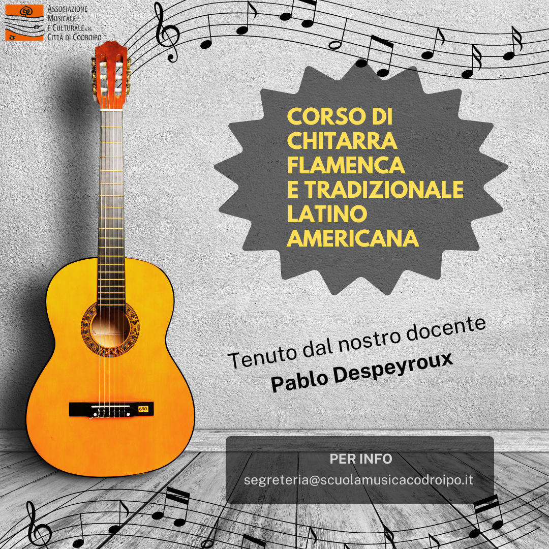 PROFESSORE: Pablo Despeyroux. Professore superiore di chitarra classica, master in flamenco per la ESMUC di Barcellona. Inoltre conosce in profondità la musica popolare latinoamericana e il tango, avendo accompagnato