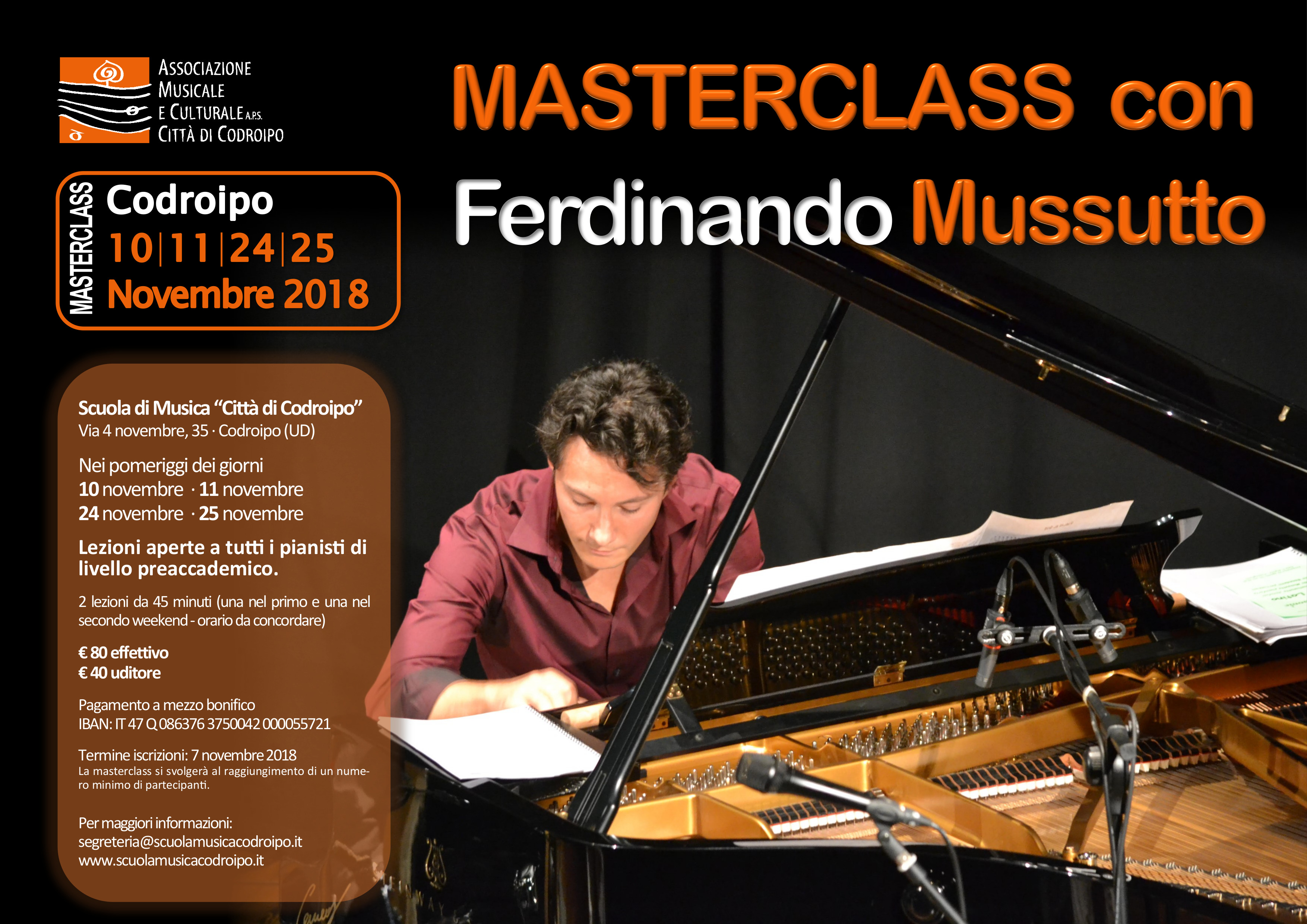 Lezioni aperte a tutti i pianisti di livello preaccademico per la Masterclass con il m° Ferdinando Mussutto, nei pomeriggi dei giorni 10-11 e 24-25 novembre 2018.