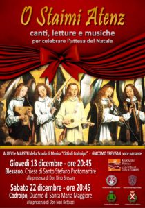 O staimi atenz. Canti, letture e musiche per celebrare l’attesa del Natale, progetto del dipartimento di classica, in collaborazione con il dipartimento di linguaggio musicale. Giovedì 13 nella chiesa di S.Stefano Protomartire a Blessano di Basiliano, sabato 22 nel duomo di Codroipo alle ore 20.45.