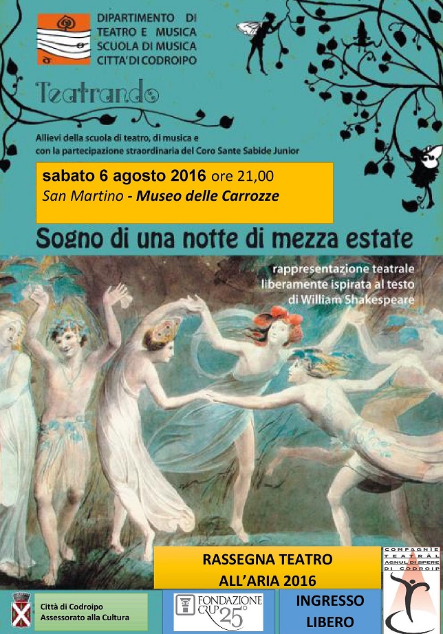 Gli allievi del Dipartimento Teatro assieme agli allievi dei Dipartimenti di Musica della Scuola di Musica “Città di Codroipo” e con la partecipazione straordinaria dei ragazzi del Coro Sante Sabide Junior Vi invitano ad aspettare accanto a loro l’arrivo del solstizio d’estate, sotto le magiche stelle di Corte Bazan.