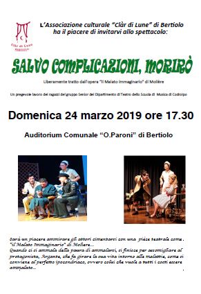 Domenica 24 marzo 2019, alle ore 17:30 presso l’Auditorium Comunale “O. Paroni” di Bertiolo (Udine), Salvo complicazioni, morirò, commedia brillante liberamente tratta dal Malato immaginario di Moliére. Gruppo Senior del dipartimento di Teatro, regia di Monica Aguzzi.